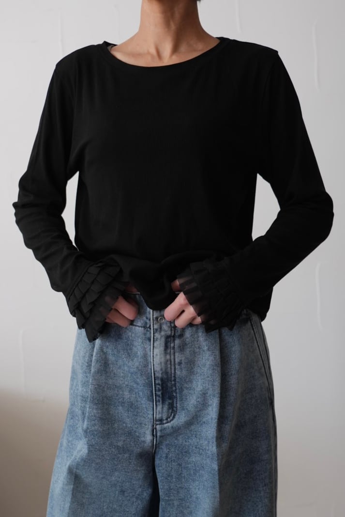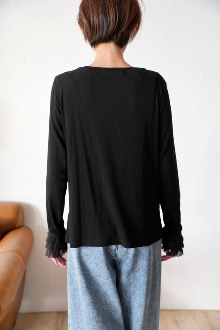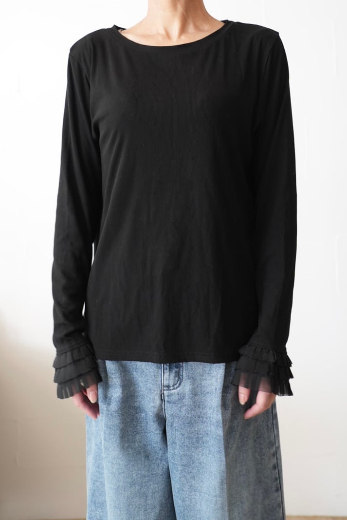 313. Anna Kerry / アンナケリー 袖口フリル リブロンT (ブラック)(56254917)