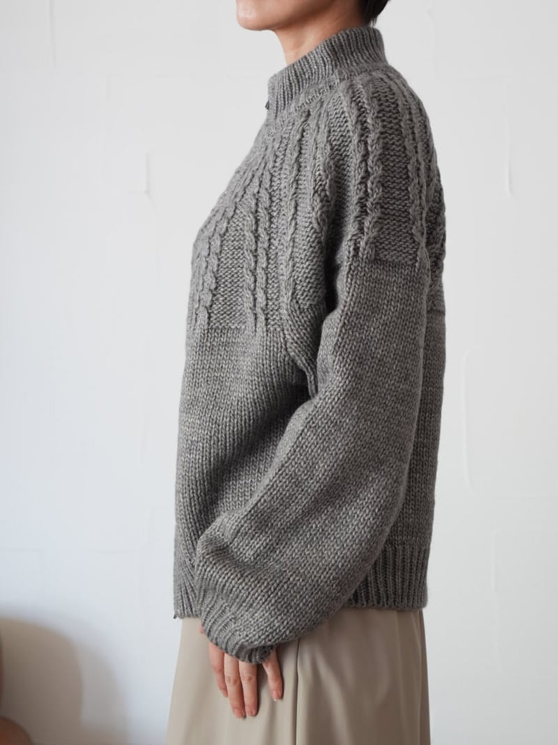 ロービングヤーンを引き返し編みで、上部のみケーブル柄に編み立てた、タートルネックのニットブルゾン。