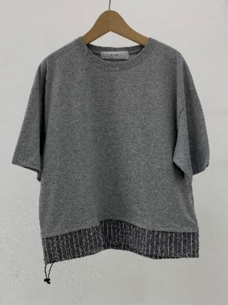 5.6ozの程よい肉厚の綿100%天竺編みカットソーとニードルパンチストライプシャツ生地のコンビネーション。ゆったりとしたフォルムです。
