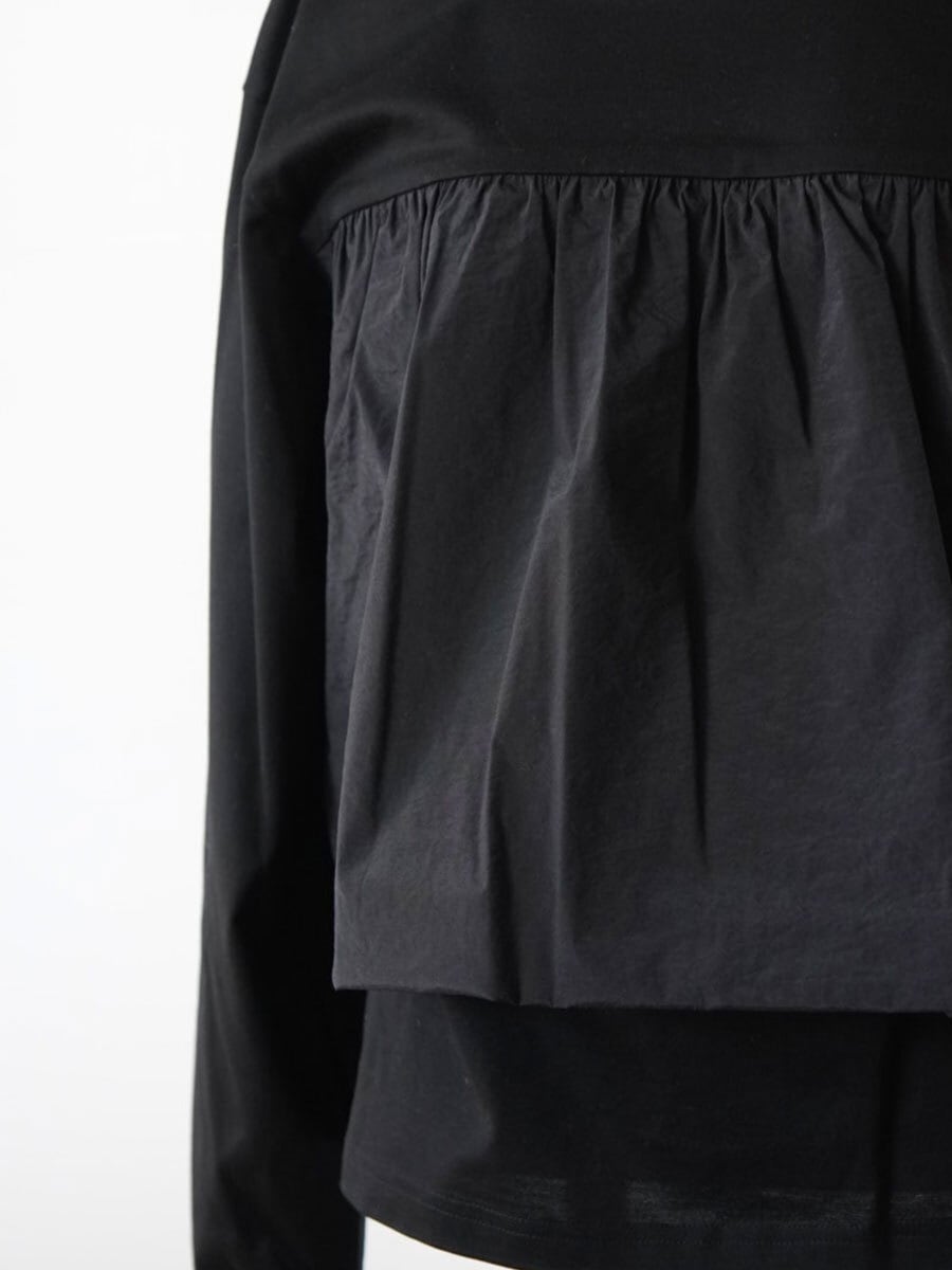 バルーンビスチェが付いたようなトップス。ベースの綿素材に対して、シアーナイロンPUの合わせが今年らしい組み合わせです。