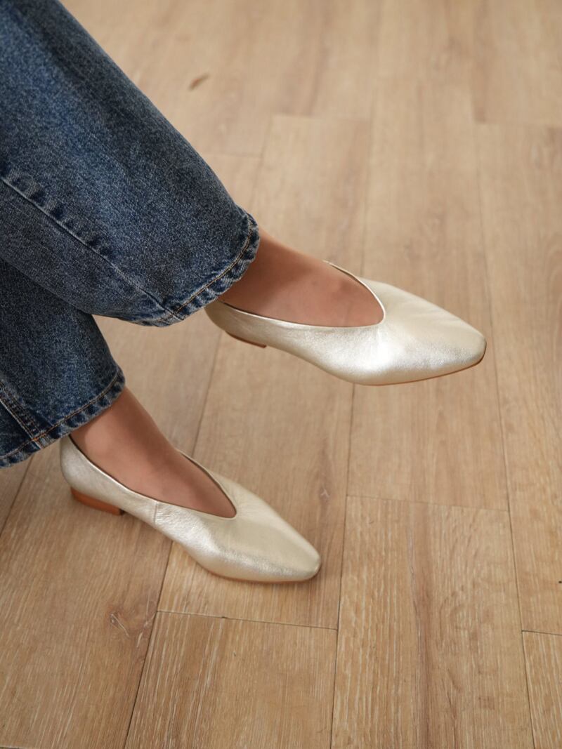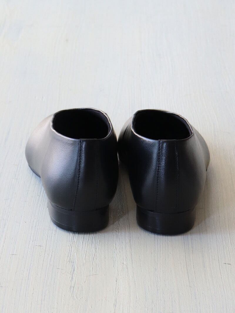 履き口が「V字」にカットされており、足元をすっきりと華奢に見せてくれます。甘くなりすぎないスクエアトゥも人気の理由です。