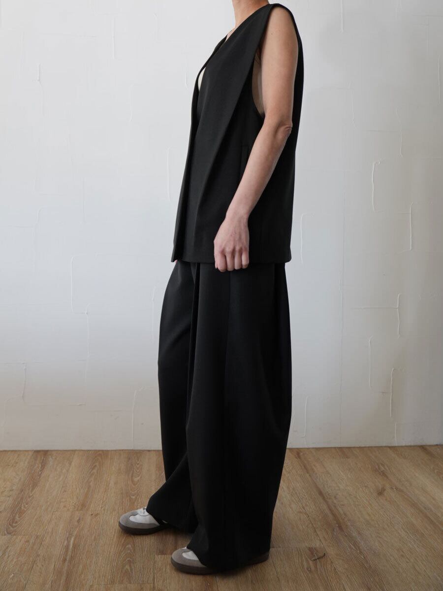 ジレ(616412)と同素材で、セットアップとしても着用可能なワイドパンツ。 ボリューム感がありながらも、広がりすぎない計算されたストレートシルエットが、洗練されたマニッシュなスタイルを演出します。