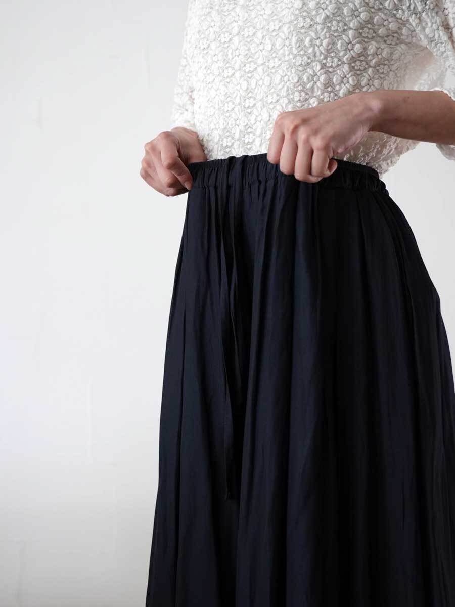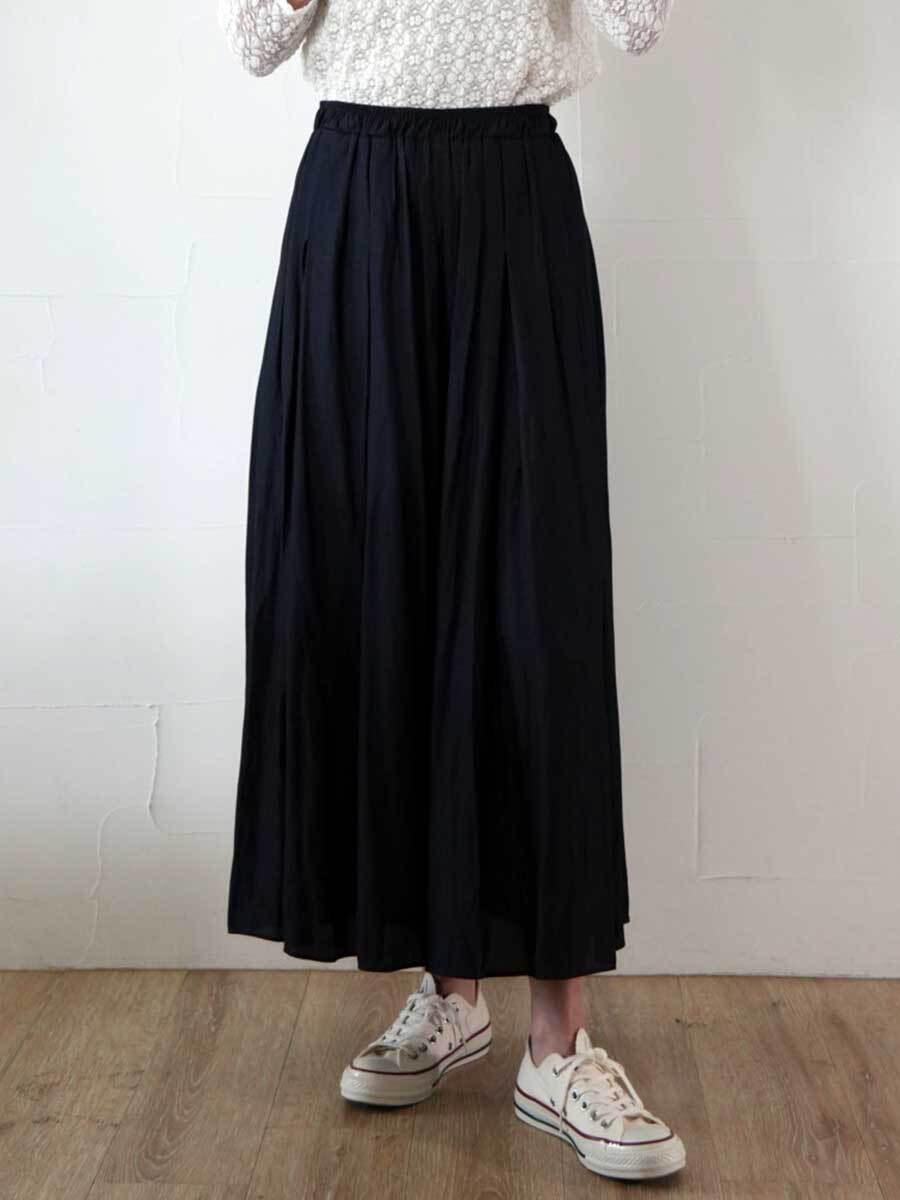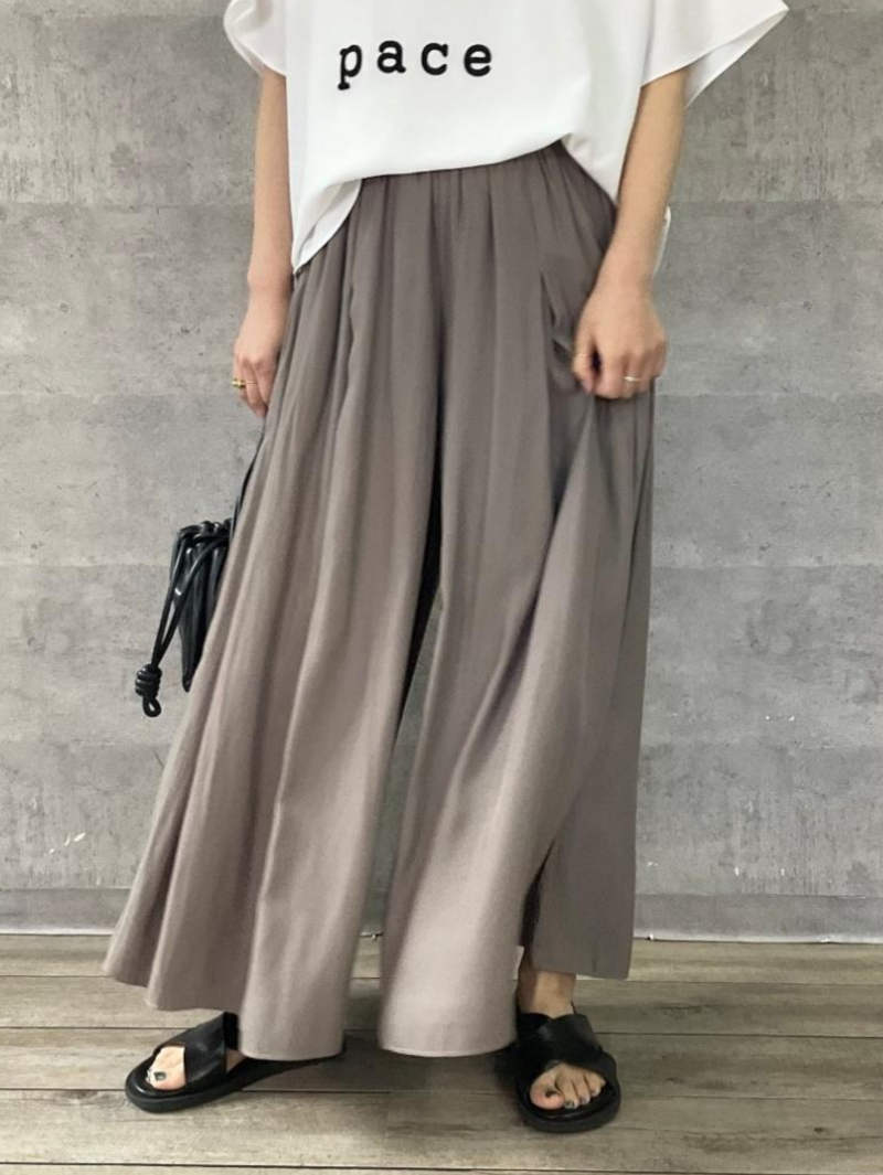 タックとギャザーをたっぷりとったスカート見えワイドパンツ。