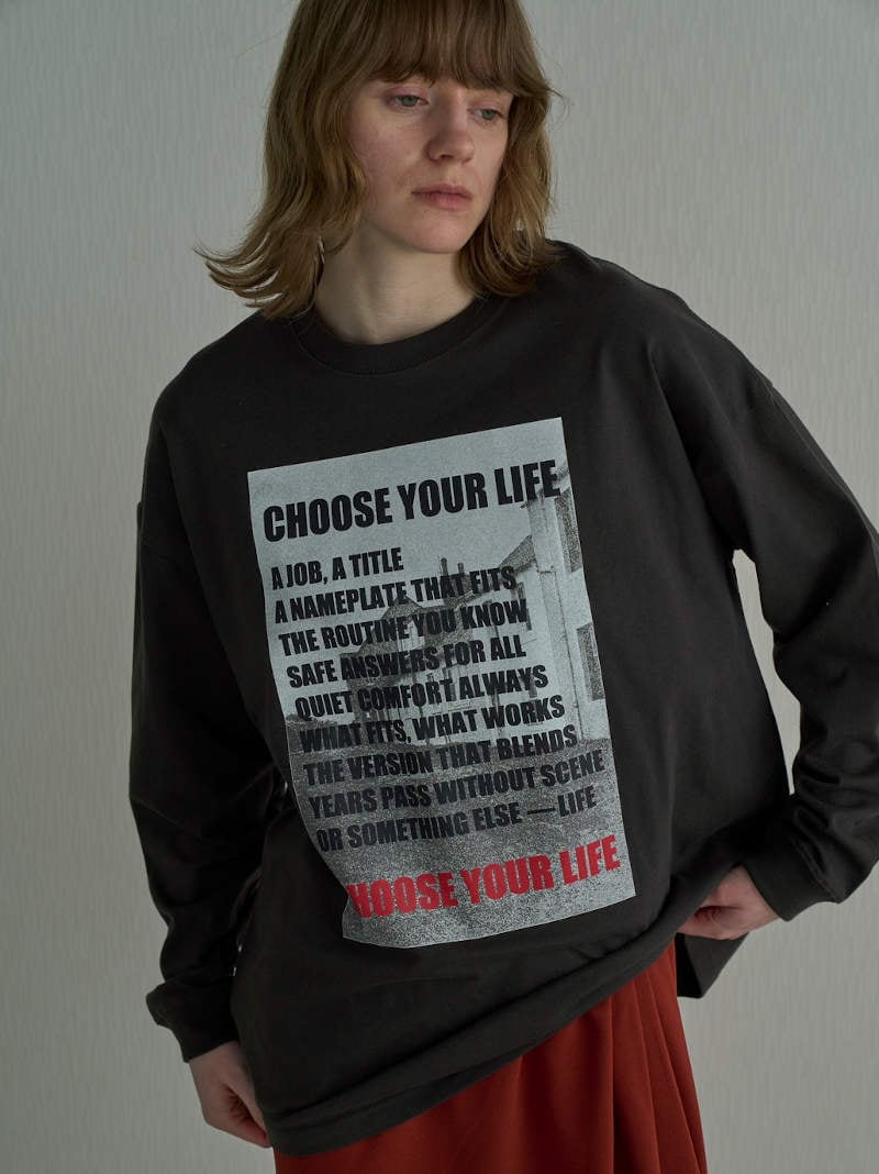 ゆったりとしたシルエットで、リラックス感のある着心地に仕上げたロングスリーブTシャツ。モノクロフォトに大胆なタイポグラフィを重ねたグラフィックが印象的なデザインです。“CHOOSE YOUR LIFE”のメッセージがさりげなくカルチャーの空気感を漂わせ、1枚でスタイリングのアクセントになるアイテムに仕上げました。